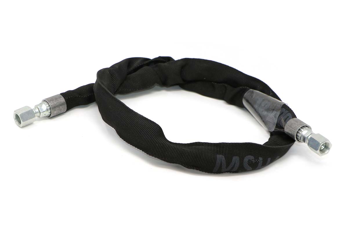 Hydraulic Hose with Cover, 6711670 connects to cylinders for attachments like landscape rakes, backhoes, clamps, and combination buckets, and excavator blades.