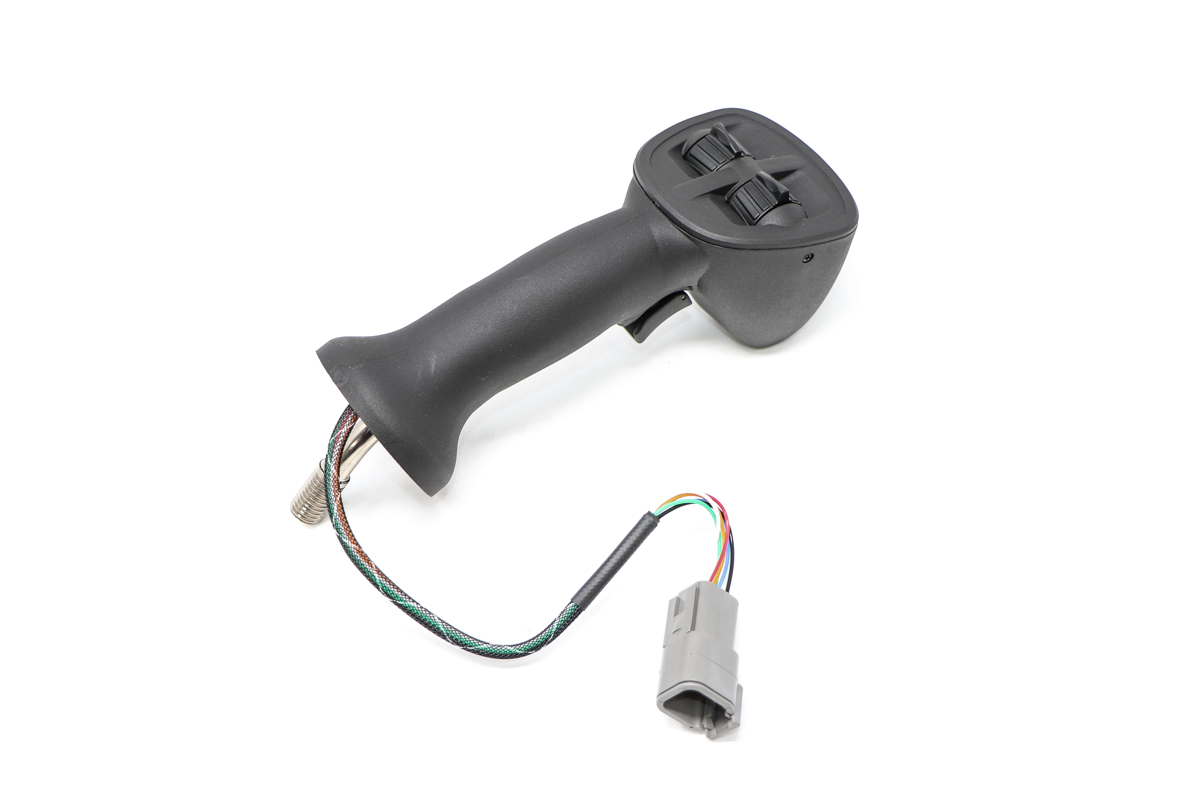 Joystick Handle for Articulated Loaders, 7403735 inserts into the instrument panel and connects to the main valve and the cab harness. Consists of an index trigger button and fingertip auxiliary or telescopic controls that facilitate quick, simple operation.