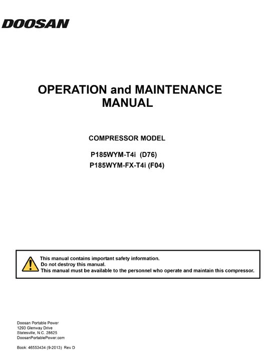 Bobcat Portable Power P185 OPS Manual, 46553434 or Owner's Digital Manual provides the owner or operator with instructions on the safe and proper operation and maintenance.